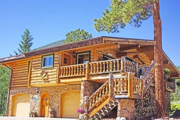 The rustic log-sided 2800 SF lodge-style home is itself a part of the beauty of Antero Mountain Ranch. Exterior doors, with gorgeous stained glass, allow access to decks where you can breathe in fresh mountain air and envelope yourself in the wonder of nature. The great room, with its wood stove, rock hearth, and log mantel, beckons you to spend time. The cathedral ceilings with their log beams, the aspen tongue and groove, and the designer, earth tone colors all blend together to create a lodge-style atmosphere. There is a total of four bedrooms and three baths. The main level master suite provides a private area inside and out with its own deck access with views and a perennial rock garden. Another roomy bedroom and bath with a walk-in, tiled shower is also on the main level. The lower level encompasses two more bedrooms, a bath, and a Swiss-s...