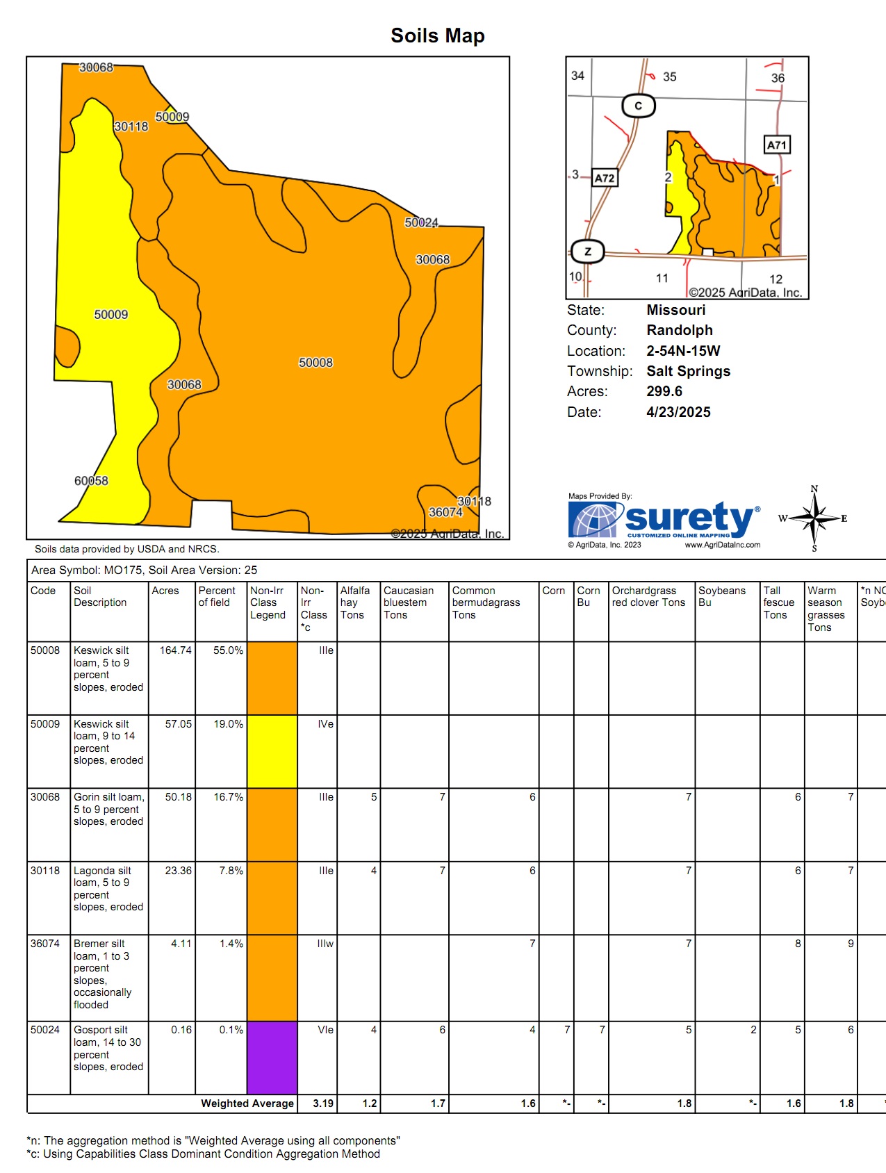The farm features predominantly Class III soils with gentle 59% slopes, ideal for agriculture. Primary soil types include Keswick, Gorin, Lagonda, and Bremer Silt Loamswell-regarded for their productivity and drainage.