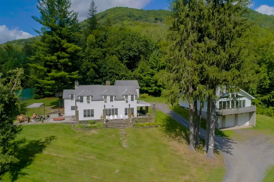 THE WORLD BEGINS at the end of this road. Unique gem at the beginning of a remote country road to Chichester/Phoenicia nested inside the surrounding 7,000 acre NY State "forever wild" forest. A hole in the donut amidst thousands of acres of primordial wilderness, these three houses are at a comfortable elevation of 1,300 feet and look out at a wide panorama of several mountains climbing in the distance. Enjoy the aerial video at [https://youtu.be/of-mBSUc2_c] and appreciate the 3D walk-thru tours at [https://my.matterport.com/show/?m=ND6PJPWbaJg&brand=0] also [https://my.matterport.com/show/?m=Vg3tQbNyEBg&brand=0]. The wide lawns and field offer recreation and entertainment opportunities that have hosted hundreds of people to special events. Venue opportunities for Weddings, Conferences, Retreats, Parties, Family gatherings, your imagination? Incorrect information on ZILLOW should correctly say that Property Taxes are approximately $17,426/year and Insurance is about $2,505/year. 300 acres of forested mountains are surrounded by the 3,500+- foot highlands of Tremper/Carl/Warner Mountains. The wilderness has few access points so is relatively untouched for hunting, fishing, and hiking with abundant flora and fauna. The property rises from the three homes at 1,300 feet elevation to 1,800 feet and beyond to 3,845 feet. There are three homes, the estate's Manor House, a Ski Chalet above the three garage bays, and a Summer Cottage. A trout stream Warner Creek, runs a mile through the property with deep pools in the "Red Rocks" and gravel banks, and is fed six miles away from the slopes of Plateau Mt at 3,845 feet. A Manor House with about 2,468 sqft, four bedrooms and 3-1/2 bathrooms is extensively renovated in 2007 (thus the effective age of 11-20 years in the data sheet) with modern conveniences, accessories, insulation, siding, roof, reinforced structure, and modern electric system with standby generator. A flagstone patio surrounds two sides of the house. A wooden deck overlooks the swimming pool from the Pergola shelter next to the California Cedar deep hot tub. Next is the Ski Chalet, with about about 1,800 sqft of living space, can easily sleep a dozen under the 12' high cathedral ceiling with a vast window wall opening to a deck to look out at the wide panorama. There is a sleeping loft, one private bedroom, a common full bathroom with an unusual shower/steam room that can seat several beneath seven shower/steam heads. Heated and air conditioned, this four season home is ideal for large groups and entertaining in the central great room. There is a loft above with circular stairway up and another circular stairway down from the great room to the four car three bay garage. The entry mudroom has large storage for skis and clothing. Behind along the edge of the forest is the Summer Cottage with about 786 sq ft, is a convenient three bedroom, one bath getaway located along the edge of the forest and looks out at the swimming pool and tennis court. The in-ground heated gunite swimming pool is 32' x 22' with a diving board.Behind is the fenced macadam doubles tennis court. Appliances in the Manor House include Viking 6 burner gas stove/convection oven,Samsung refrigerator/freezer, Miele dishwashers, Broan compactor, Buderus boiler. Appliances in the Ski Chalet include Whirlpool stove/oven, Broan hood, Kitchen Aid dishwasher, Kenmore refrigerator/freezer, and split AC units. Watch the two 3D walkthrough videos at: Manor House--[https://my.matterport.com/show/?m=ND6PJPWbaJg&brand=0] Ski Chalet--[https://my.matterport.com/show/?m=Vg3tQbNyEBg&brand=0] Move your cursor around the room to look at the different perspectives, and click onthe several circles shadowed on the floor to move through the house. Watch the Video aerial and interior video:[https://www.youtube.com/watch?v=of-mBSUc2_c&feature=youtu.be] ZILLOW should correctly say that Property Taxes are approximately $17,426/year and Insurance is about $2,505/year,