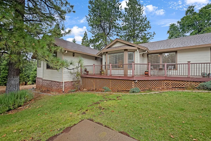 Nestled in the Sierra Nevada Foothills you'll find this wonderful single story home. Enjoy views of tall pines in a beautiful setting on 3 acres. Step into the formal entry and find the formal living room and dining room with lots of windows to let the light shine in. The family room is complete with a cozy wood stove, hardwood flooring and access to the back deck and private backyard area. The kitchen offer solid surface counters with eat in breakfast nook, gas cook top, and large pantry. Off the kitchen you will find a good size laundry room with cabinets and sink. This home features 4 generous bedrooms. The primary suite has vaulted ceilings and a large walk in closet. The attached bathroom has dual sinks, spacious walk in shower and separate soaking tub. The 3 car garage provides lots of storage and plenty of room for your autos. There is a sports court or additional parking on the s...