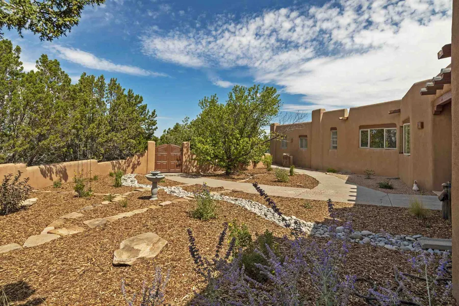 This private and tranquil home is surrounded by mature trees and nature. Large windows create an abundance of natural light throughout the home, creating an intimate connection in which to view nature. The home is situated on 3.1 acres. The lot itself has views of both the Jemez and Sangre de Cristo mountain ranges. This 3BR/2BA single-level home has an open floor plan, formal dining room, spacious living room with fireplace, flagstone boncos, magnificent picture windows, large kitchen with granite countertops, an island and breakfast nook, plenty of storage area, including walk-in pantry, separate, bright laundry room, and an attached 2-car garage. The spacious master bedroom has a kiva fireplace and could easily accommodate a private office and quiet reading area. Southwest style is evident throughout the property and includes vigas, lintels, corbels, and plaster walls, and all three bedrooms have Oakwood floors. There is a covered entry portal, evaporative cooling, and radiant heat. The residence has a walled, private front and back courtyard, both enclosed with wooden gates, and ideal for entertaining or relaxing. There is also ample parking and a convenient round-a-bout to accommodate guests and/or deliveries. Residence is located within easy access to both shopping and art galleries in Santa Fe and is located within a couple of miles from extensive trails for hiking, mountain biking, trail running, and horse riding.