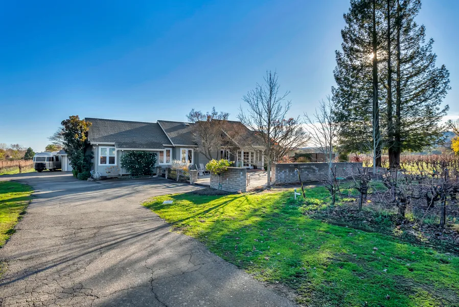Welcome to Lark Avenue...Through the gates are 6 stately custom vineyard estates. 1070 Lark sits on 3.01± private acres of historic producing vineyards that surround this gorgeous single level home. The home has been meticulously maintained and stylishly remodeled and expanded. This solar efficient home boasts 3 bedrooms, spacious office, 2 full baths, living room with cathedral ceilings, and a family room open to the remodeled kitchen. The separate formal dining room, spacious primary suite, detached garage with an 800± bottle conditioned wine cellar and large storage room complete this special property. Enjoy expansive Sonoma Mountain western views from the landscaped yard, 2 decks and a lovely heated/covered pool. Public sewer. Yours to love.....