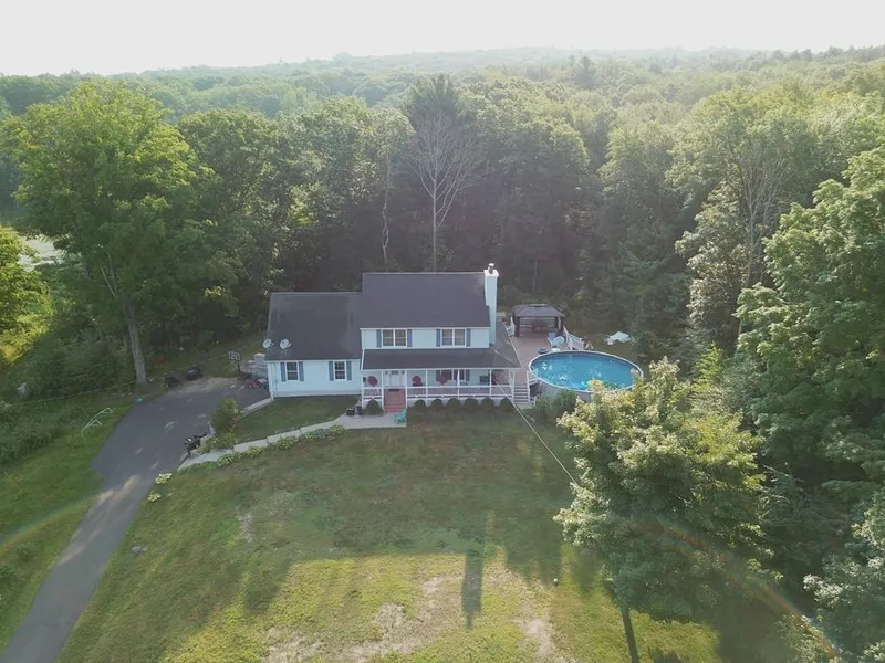 FALL IN LOVE w/this Meticulously Maintained 4bd Colonial on over 3 acres of land abutting The Brimfield State Forest! Bask in the beauty of the nature that surrounds you w/access to a pond & State Forest! A full front porch, huge composite deck with cabana, above ground pool, patio, fenced in play area makes this the perfect summer oasis in your back yard!Gorgeous Remodeled kitchen w/sparkling granite and tile backsplash, cozy radiant heat in the beautiful tile floors, Stainless Steel Appliances, Ample Cabinetry, breakfast bar open to the spacious dining room that can accommodate multiple dinner guests. A formal living room with gorgeous wood burning fireplace. The first floor also includes a 24x24 bonus room with custom built ins & fabulous bamboo floors. The second floor boasts 4 spacious bedrooms, 2 full baths & closets galore! A partially finished basement with an exercise/playroom, ...