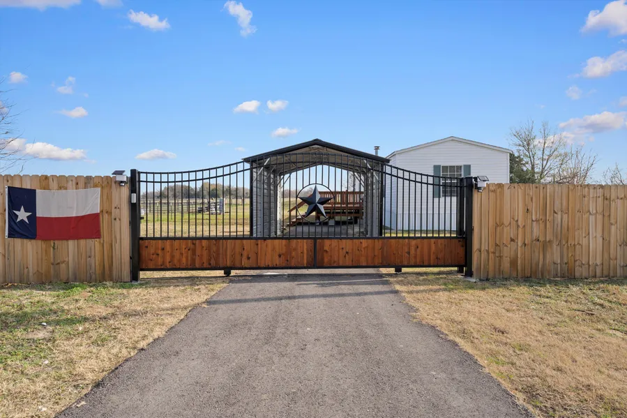 As you enter the driveway you are greeted by a beautiful black automatic sliding gate with keypad, branded with a Texas star!