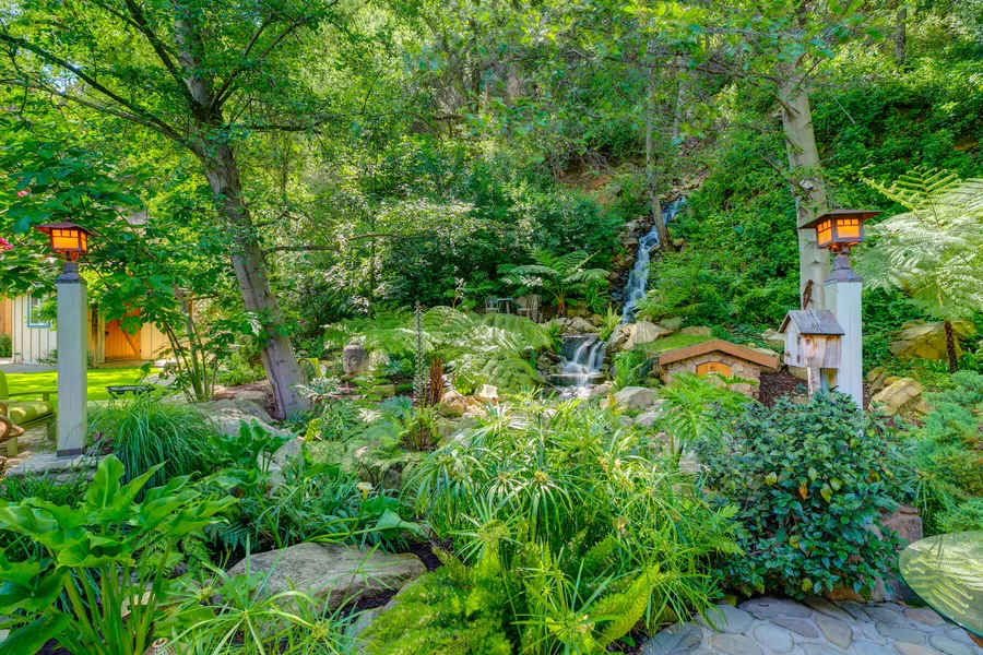 A true one of a kind Ojai hideaway an oasis that feels like another world but just over four miles from downtown Ojai. With a custom built and designed waterfall feature that cascades down the back landscape, all surrounded by thriving and vibrant native plants and trees, the open floor plan home was built in 2003 and includes 3 bedrooms and 3 baths. With rich hardwood floors, a light and airy living room with vaulted wood ceilings and a masterful rock fireplace, and an open kitchen including Viking appliances, this home provides all the creature comforts. A screened in patio that wraps around the back of the home providing great indoor and outdoor living space while you listen to the water trickle down the falls. The perfect Ojai retreat for one looking for peace and tranquility.