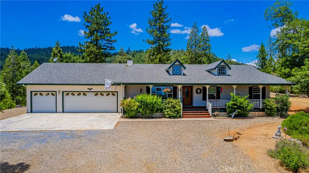 Charming custom-built home on 3.14 private acres! This 3-bedroom, 2.5-bath, 1550 sq ft home offers a warm and inviting feel with a cozy wood stove and spectacular views from the welcoming front porchperfect for enjoying peaceful mornings or evening sunsets. The 3-car attached garage includes a bay converted into a workshop, while the detached 4-car garage offers even more space, with one side finished, insulated, and ideal for a hobby shop, studio, or storage. RV hookups are a bonus for your traveling guests or outdoor adventures. Surrounded by mature trees and set in a quiet, serene location, this property is ideal as a full-time residence or weekend getaway. Enjoy the best of mountain living just a short drive to Bass Lake and Yosemite National Park.