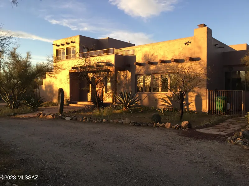Artistic and Charming Santa Fe home nestled peacefully among towering Saguaros on flat usable 3.14 pristine natural desert acres. Custom home with 24'' adobe walls, wood plank and Viga ceilings. Inviting beehive fireplace in spacious great room, concrete and flagstone floors. Enjoy the lovely flagstone patios with wood Vigas, and the wonderful rooftop deck with magnificent 360 views of the city and mountains. The property includes a well-situated private -Guest House- 883 sf 1/1 - complete with full kitchen and carport. Only a 3-minute drive to Christopher Columbus Park for boating, fishing, BBQ, and entry to the many miles of paved bike path to enjoy safe and scenic cycling, as well as quick access to Silverbell Golf Course, driving range & practice area. Located in a great neighborhood