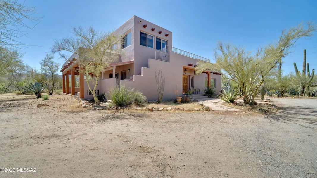 Artistic and Charming Santa Fe home nestled peacefully among towering Saguaros on flat usable 3.14 pristine natural desert acres. Custom home with 24'' adobe walls, wood plank and Viga ceilings. Inviting beehive fireplace in spacious great room, concrete and flagstone floors. Enjoy the lovely flagstone patios with wood Vigas, and the wonderful rooftop deck with magnificent 360 views of the city and mountains. The property includes a well-situated private -Guest House- 883 sf 1/1 - complete with full kitchen and carport. Only a 3-minute drive to Christopher Columbus Park for boating, fishing, BBQ, and entry to the many miles of paved bike path to enjoy safe and scenic cycling, as well as quick access to Silverbell Golf Course, driving range & practice area. Located in a great neighborhood