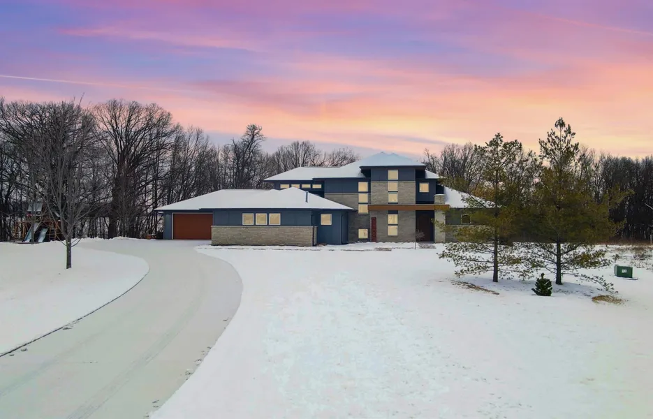 Modern Contemporary Inspired home situated on 3.17+/-wooded acres. Step inside to a grand foyer with views into the gourmet kitchen with granite countertops, high appliances, island and walk-in pantry. Eat-in dining area with patio door leading to the patio. Living room with gas fireplace flanked with cabinets and a wall of windows. Primary bedroom w/ large walk-in closet, bath w/ dual sinks, tile walk-in shower and soaker tub. Office, half bath, laundry and large mudroom complete the main floor. Upstairs find 1 bedroom with a full bath and 2 other bedrooms with an adjoining bath. Loft area leads to a finished bonus room. LL offer a family room with wet bar area & exercise room. 2 separate attached 2 car heated garages, geothermal heating, some smart home features, landscaped lot and more.