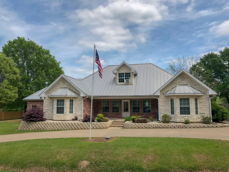 Original owner was the builder, custom brick and stone with metal roof, side entry garage, plus circle drive. Split bedroom, master bedroom and 2nd bedroom have vaulted ceilings and bay window seats, family room has stone fireplace with gas logs, large eat-in kitchen with views of the shady back yard. Upstairs, there is a bonus room with a pool table! Hickory cabinets, tile floors in living,dining,kitchen areas, molding, builder said ~ 2x6 construction,R19 walls, R38 attic, tinted windows for energy efficiency. The fully fenced large lot has a 50x30 shop with 220, concrete floor, man cave area. There is another storage building, dog run, fire pit, covered patio and almost new hot tub. Lot of bang for buck!