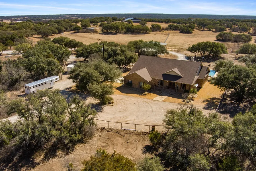 This 23.4 acres has a beautiful custom built 3/2 home with high-end features. The home offers open concept living room & kitchen with breakfast area and separate dining room creating space for large groups and good flow for entertaining. The kitchen has granite counter tops, custom cabinets, island, eat in bar, stainless appliances and a large pantry. Bedrooms are a split arrangement with spacious master bed and bath. The master bath has granite countertops, tile flooring, and a garden tub with separate shower. The two additional bedrooms have carpet and share a bathroom. There is also a utility room with freezer and refrigerator space and a large garage. Another feature for the home is a standby generator. Outside features are equally beautiful and enjoyable as the inside..the in ground pool with tanning ledge and new cleaning system will provide hours of fun and relaxation for family and friends. A newly constructed 60x30 horse barn with 4 stalls, spray foam insulation, water, electric, plus 15 acres in turnouts provides a home for horses. The land is fenced & cross fenced and also has a 30x24 shop heated and cooled with electric, water, and spray foam insulation. There is one surface tank to provide water for livestock and wildlife and two entrances on the paved county road. Cover is great with lots of live oaks and other trees native to the area. Call Teresa Lee at 325-647-5461 for more information or to schedule a showing of the property. Boundary lines are approximate.