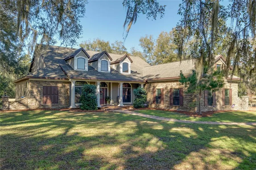 Immaculate custom built 4 bedrooms, 3 1/2 bath home situated on 3.21 beautifully maintained acres. Nestled in sought after Alachua Highlands neighborhood. This home boast many upgrades: wood flooring throughout, crown molding, columns, plantation shutters and multiple niches. Oversized primary bedroom has double walk in closets. Primary bath offers double sinks, large tub and spacious walk in shower. The 3 way split floor plan allows for privacy and offers in-law suite/guest bedroom with its own ensuite bath. Kitchen has light cabinets, granite countertops and stainless appliances. Family room boast gas fireplace with french doors overlooking covered screened back porch. Enjoy the stunning views of massive oak trees as you entertain from your porch. Paver driveway leading to meticulously maintained 3 car garage. This property is equestrian friendly. Conveniently located only minutes away from Gainesville and Alachua. Perfectly gorgeous move in ready home.