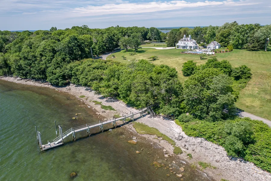 This stunning, 3.2 acre, seaside compound is set on a sprawling lawn that gently rolls down to its own dock, mooring, and a secluded beach. Impeccably renovated, every feature, finish, appliance and system are new. The first floor is fully open, creating seamless flow through the dining and living spaces. Walls of windows and French doors invite light and water in at every angle. The gourmet kitchen has custom cabinetry, Subzero, Wolf and Bosch appliances, quartz counters and island. The first floor also features a large ensuite bedroom addition. Upstairs, a breezy seating area opens to a balcony overlooking the pool, apple trees, fragrant lavender and the bay. The adjacent primary suite has cathedral ceilings, a gas fireplace and office area. Two additional ensuite bedrooms and new balcony complete this floor. The lower level is finished with a gym, media room, office/BR, spacious laund...