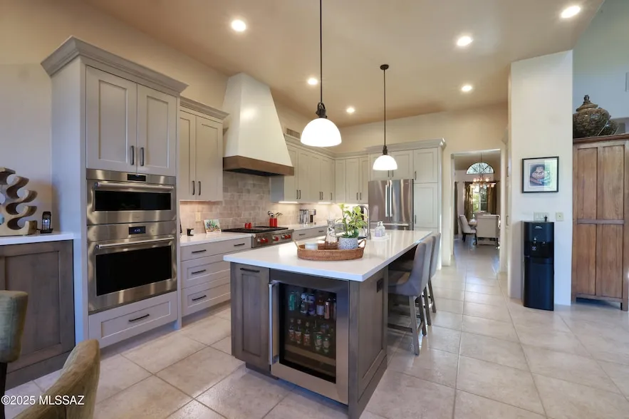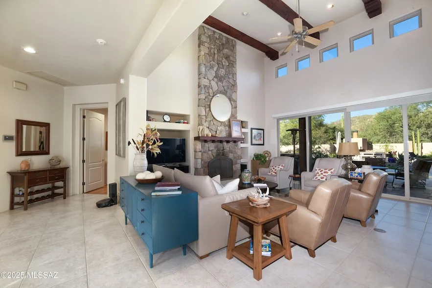 This beautifully updated home features breathtaking mountain views on 3.2 Acres with a 4 car garage & Rock waterfall and elevated heated spa that flows beautifully into the heated pool. A gated front courtyard with a soothing fountain welcomes you and sets the tone for what you're about to experience. Step through the custom mesquite entry door into a light-filled living space with walls of windows that frame the surrounding scenery. The gourmet kitchen, completely remodeled in 2023, showcases shaker-style cabinetry with lots of drawers. All Stainless steel appliances with Bosch refrigerator and top of the line WOLF gas cooktop with griddle, WOLF convection oven, WOLF steam oven. - a dream for any home chef. With 4 bedrooms plus an office, plus a den/TV room and 4 full baths... there's plenty of space for everyone. The luxurious primary suite offers a private sitting area, a two-sided fireplace, spa-like bath, and a large walk-in closet. Step outside to your resort-style backyard featuring a sparkling pool with rock waterfall, heated spa, outdoor fireplace, and artificial turf for easy care. The built-in outdoor kitchen with BBQ and seating is perfect for entertaining under the stars. Additional highlights include a tankless water heater (2021), two newer HVAC systems (2019), and a high-efficiency water softener. All this just half a mile from the trailhead, where you can enjoy hiking and the beauty of nature right outside your door.