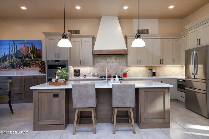 This beautifully updated home features breathtaking mountain views on 3.2 Acres with a 4 car garage & Rock waterfall and elevated heated spa that flows beautifully into the heated pool. A gated front courtyard with a soothing fountain welcomes you and sets the tone for what you're about to experience. Step through the custom mesquite entry door into a light-filled living space with walls of windows that frame the surrounding scenery. The gourmet kitchen, completely remodeled in 2023, showcases shaker-style cabinetry with lots of drawers. All Stainless steel appliances with Bosch refrigerator and top of the line WOLF gas cooktop with griddle, WOLF convection oven, WOLF steam oven. - a dream for any home chef. With 4 bedrooms plus an office, plus a den/TV room and 4 full baths... there's plenty of space for everyone. The luxurious primary suite offers a private sitting area, a two-sided fi...