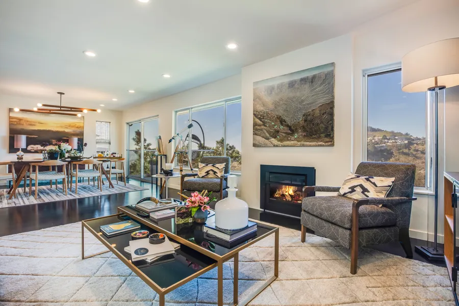Highly polished, modern design anchors this luminous mid-century home. The expansive layout embraced by stunning canyon views, glorious natural light, and an impressive series of native gardens brings the beauty of the natural world into daily focus. Set on an extra deep lot with beautifully articulated landscaping, the sparkling views of Glen Canyon and Mount Sutro inform robust, outdoor living areas lush with native plantings. A handsome faade leads to the generous foyer, two serene bedrooms, and access to the two-car, side-by-side garage, and laundry. Upstairs are impressive, open living spaces and the professionally appointed kitchen which includes Subzero refrigeration and Wolf range, substantial work island, integrated home office, and ample storage space. The living and dining areas are graced by a gas fireplace, spectacular views, and a private deck, resulting in a sought-after o...