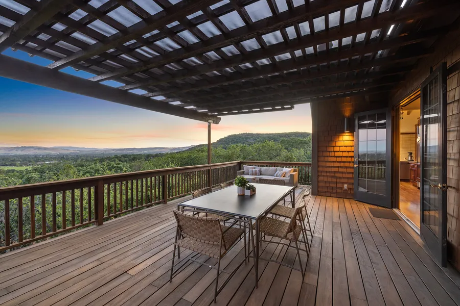 Sweeping Wine Country views yet only a few blocks east of the historic Plaza. Located in The Ranch, one of Sonoma's premium neighborhoods, this 3 bedroom + den/3.5 bath home has complete privacy. Interior features include vaulted open beam ceilings, hardwood floors, fireplace, and a wall of French doors leading to large deck providing expansive views. Lower level ideal for guests with it's own separate entrance leading to large sitting room, bedroom, and full bath. Over 3 acres of majestic Oaks and open space providing ample space for pool if desired. Solar and Tesla battery wall.