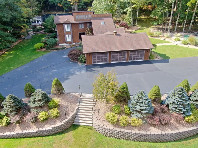 Private Estate and Retreat with Lake Rights on 3.28 Acres (Just 2 miles from Lake Wallenpaupack). 4 Bedroom 3.5 bath plus office and/or 5th Bdrm/ 3000+ Sq. Ft custom built contemporary, oversized 3 car garage with paved driveway. Professionally landscaped grounds featuring 16x37 in ground pool, pool house or art/yoga studio with kitchenette and bathroom. Complete outdoor all Viking Chefs kitchen, covered Sauna and Jacuzzi. Sports courts (Tennis, volleyball, handball) and 2 serenity ponds with Waterfalls. Property fenced & private- Must see to appreciate.