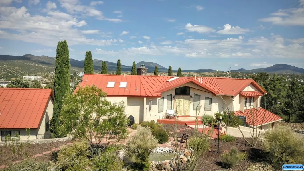 Beautiful hillside custom home! This 5 bedroom, 3 bath home is an impeccably designed mid-century style gem, overlooking the town of Silver City, while offering an amazing amount of privacy. Light-filled rooms with Mountain Views, Built-in Bookcases, Custom Stone Fireplaces, Formal Dining Room and a sleek, Modernized Kitchen with Granite Countertops and Stainless Appliances. The primary suite boasts an oversized bathroom with a double vanity plus a walk-in shower. Amenities include: Seamless Metal Roof, Tankless Water Heater, A/C and evaporative cooling, enclosed garages for 4 vehicles, workshop with restroom, gas fireplace inserts, hot tub, remote front gate, video surveillance system, 220v in shop and more. The lower level features a full kitchen, family room, a large home office/bedroom, two more guest bedrooms and full bathroom, making a perfect place to accommodate extended family.