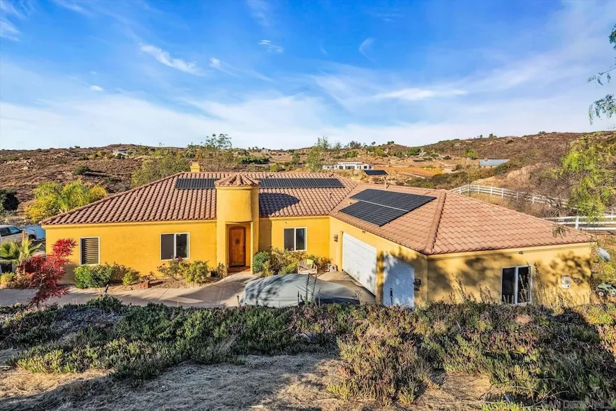 Ask About Our 2-1 buy down Interest Rate Reduction Program - Stunning West End Ramona Retreat with Panoramic Views, Paid Solar, and Room to Grow! Serene sunrises and breathtaking sunsets await you at this exceptional 3.29-acre estate in Ramona s highly desirable West End, just minutes from the region s wine country. Built in 2005, this meticulously maintained 3,000 sq ft home offers a rare combination of privacy, elegance, and versatility with no HOA, fully paid solar with Tesla battery backup, fast internet avail. and panoramic views of the surrounding hills and tranquil pond. Step inside to discover soaring, 10-foot-high ceilings, custom wood shutters, new Milgard windows, dual zone climate control, and 8-foot doors. Abundant natural light creates a welcoming, airy atmosphere. The gourmet kitchen is a chef s dream, featuring granite countertops, built-in ovens, a large center island, and a drop-in gas range. Enjoy peaceful morning views from the breakfast nook and cozy evenings by the fire in the open concept living area. ASK ABOUT ARE 2-1 Buydown Finance Option. The private master suite is a true sanctuary with its own fireplace, walk-in closet, luxurious en-suite bathroom with dual stone vessel sinks, soaking tub, walk-in shower, and private outdoor entrance with serene pond views. On the opposite wing of the home, two generously sized bedrooms share a full bathroom, along with a conveniently located powder room.
