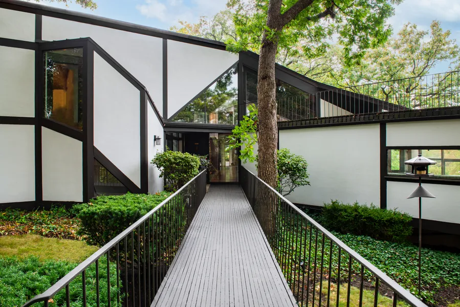 This extraordinary Harry Weese designed home with pool and tennis court is situated along the Kishwaukee River with mature oak trees offering privacy and tranquility only 65 miles from downtown Chicago. The stunning main level with teak and oak floors has a full height stone fireplace, soaring ceilings and large windows providing abundant sunlight. Bluestone pavers at the entrance extend to the patio and multiple decks cantilever over the river blending the interior and exterior environment. The kitchen is equipped with premium appliances, cherry cabinets and has a breakfast area solarium overlooking the river. The primary bedroom suite has a spa-inspired bath, walk-in closet with original built-in cabinetry, and opens to a second story office loft. The second story wings comprised of two offices, two bedrooms and a full bath are connected by a suspended bridge above the main living and ...