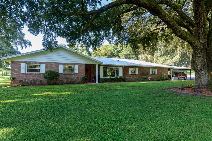 Here is your opportunity to have your own little piece of paradise! This charming home is nestled at the end of a peaceful street on 3.4 acres with mature live oak trees surrounding it. Just hang your swing and enjoy the expansive views! Inside you will love the updated kitchen and bathrooms! The 4th bedroom is currently being used as a den. All new stainless appliances updated last year, custom wood pull out cabinets, quartz counter tops and porcelain tile flooring throughout the kitchen with lots of extra storage. There's a spacious living room with a brick fireplace, built in shelves, beautiful picture window and pecky cypress wood walls local to the area. Very unique! This is the perfect home for entertaining with a large screened in patio off of the den and dining room. In addition there's a 12 x 14 cook shed with metal roof. It is completely fenced in with a cross fence for livesto...