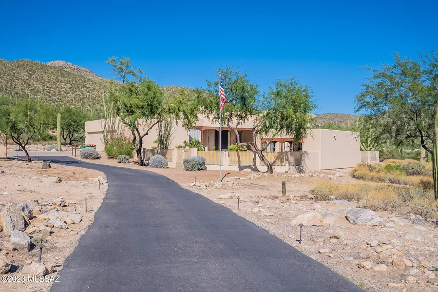 ** PRICE REDUCED WELL BELOW COMPS!! A discount on a 5-star property rarely happens. Get it while you can!! ** Southwestern and contemporary luxury at the footsteps of the Catalinas, W/ NO HOA! The home boasts an open, split level floorplan with cathedral ceilings and tons of natural light, sitting room, and a large yet cozy family room at its heart. Three bedrooms in main house plus a guest house with full bathroom! Southwest ceramic tile, granite counters, plantation shutters, gas fireplace, wet bar, luxury Viking 6-burner stove, WaterTec RO system & whole house water softener, recessed lighting, soaking tub in primary suite and balcony with gorgeous desert views are some of the features that await on the inside. Out back, you have two covered sitting areas to choose from next to a salt