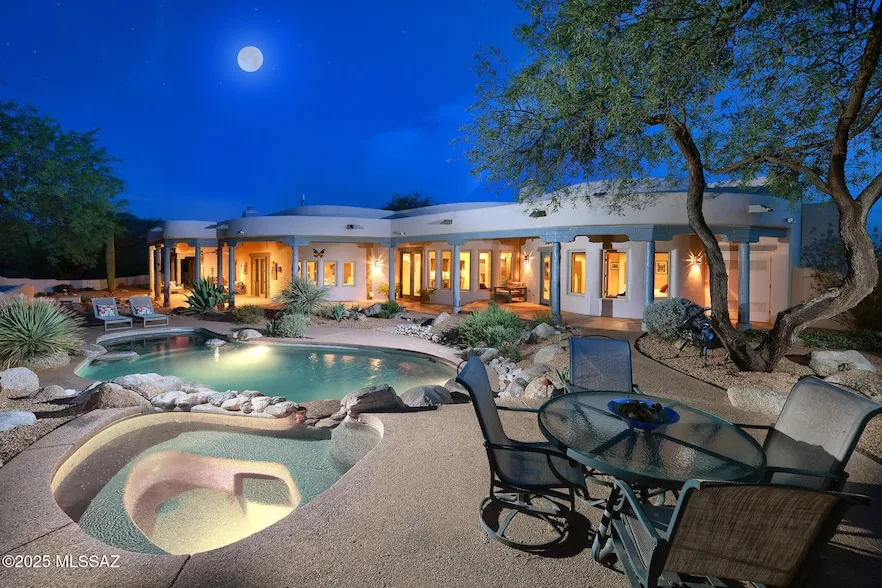 Authentic Ray Birch Home Nestled on 3.35 Acres with Breathtaking Mountain Views. This Spacious 4,205 SqFt Residence Offers 5BD/4BA & Showcases Upscale Santa Fe Charm Throughout; Kiva Fireplaces, unique Viga-Beamed Ceilings, Saltillo Tile & distinctive Saguaro Ribbed Cabinetry. Kitchen Features an Expansive Island with Bar Seating, Gas Cooktop & Panoramic Views from Bay Window. Two Luxurious Primary Suites situated on Opposite Sides of Home ensure Maximum Privacy. Your Private Outdoor Oasis is Complete with Heated Pool/Spa, Built-in BBQ Area, Cozy Kiva Fireplace & Banco Seating. The Garage Includes 2 Storage Rooms plus Heated and Cooled Studio/Workshop. Located in the Prestigious Gated Community of Sunrise Ranch, at the Base of Mt. Lemmon, w/ Hiking Trails just Steps from Your Front Door.