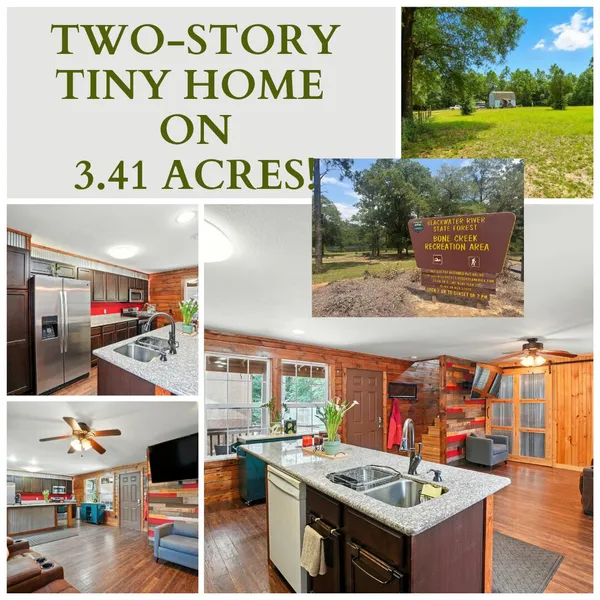 Who wants to live in a 2-STORY TINY HOME.. ON 3.4 ACRES.. steps away from the BLACKWATER RIVER STATE FOREST? Welcome to 5029 Bonecreek Road, an ECO-FRIENDLY HOMESTEAD, with gated entry and acres of fertile land for growing or grazing. You also have thick forested acreage to explore. This compact design features a multi-functional footprint with open-concept living, dining and kitchen. The kitchen is full-sized and fully-equipped with rich walnut cabinetry, corrugated metal accents, stainless appliances and large granite island. The living/dining space features rustic tongue and groove shiplap and warm wooden paneling, as well as vinyl wood plank flooring and an artistic showcase wall. Behind the barn door is your laundry room and downstairs bathroom. #KeepReading The staircase is stunning and leads to a lofted bedroom space, perfectly suited for multiple layouts. The windows flood the space with light and offer picturesque views of your homestead. The upstairs bathroom lives large with spacious vanity, walk-in shower and HUGE WALK-IN CLOSET; a rare luxury seldom found in a tiny home. Outside you'll find a covered porch, outdoor entertainment space, RV HOOKUP, storage shed, TINY HOUSING FOR ANIMALS, chicken coop, well house, firepit and picnic table. You also have wooded acreage that extends well-beyond the fence line! Speaking of fencing... The seller is offering a free gift with purchase! The buyer will receive the huge pile of BRAND NEW WOOD FENCING PICKETS (back porch) for future use... on closing day. #FREEBIES The tiny movement is growing and this is your chance to cash in... but you better hurry! This "tiny steal" is steps away from the Blackwater River State Forest and just 2 minutes away from Bone Creek Recreation Area! #SeePhotoLineup Priced for maximum attention and expected to move! Make an offer today!