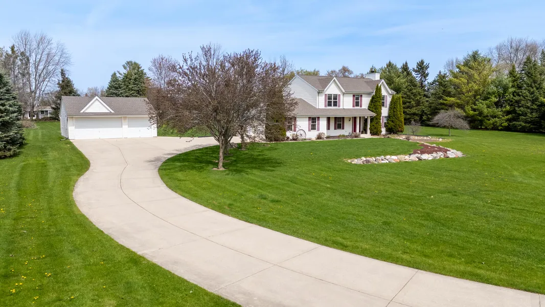 Retreat to well maintained country home. You will feel at home the minute you pull in the drive and see the beautiful yard, stone accents and pond. 3 car attached garage & 3 car detached heated garage, floored upper level ready for storage. Huge deck off the back, brick patio, an additional deck circling the 24' pool. Gazebo ready for your own finishes boasts a custom wood ceiling and ceiling fan for those warm nights. 3 bed 3 bath home with open main floor plan, Gas fireplace, first floor laundry. Freshly painted, newer carpeting on upper level, main floor simulated wood flooring. Huge primary suite w/ whirlpool tub, newly tiled shower, walk in closet 7x11. Lower level has large rec/family room ready for entertaining. Raised garden beds. Showings begin 4/25