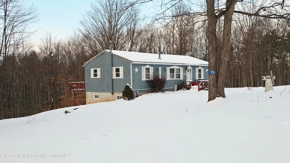 Tucked away on a private road in Cornwallville, this 1,056 sq ft ranch has an open concept kitchen/dining area/living room. This spacious living space boasts parquet floors, high ceilings, and a wood stove in the living room for a cozy winter night. This home has 3 bedrooms with the primary BR suite (BR & large bathroom) situated separately from the other two bedrooms and additional full bath. The 3.45 acre property supports an abundance of wildlife from white tail deer, wild turkeys, eagles and more which can be viewed from the large back deck. The full walkout basement with it's poured concrete foundation is convenient for storage and would make a great game room or den. Close to skiing at Hunter Mountain & Ski Windham, hiking, festivals, Zoom Flume water park, restaurants, shopping and more.
