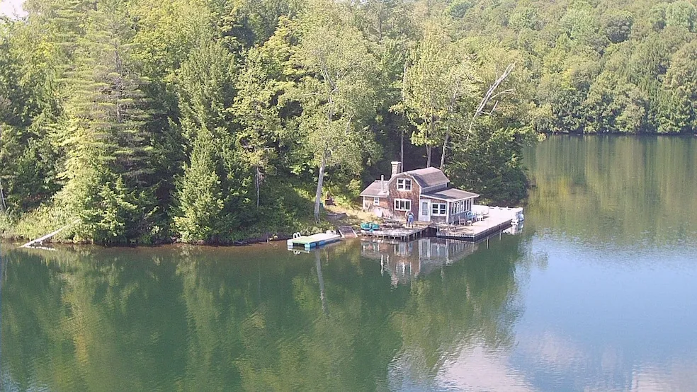 Private island with seasonal cottage and boat launch with 2-story 2-car garage at Greenwood Lake, Woodbury! The 3.3+/- acre island has 1400' of lake frontage according to Town land records. The seasonal cottage is charming and comfortable with a open floor plan and softwood flooring, being sold furnished in "as is" condition with only a few personal items and artwork excluded. First floor bunkroom plus upstairs private bedroom. Also the walk-thru hallway has room for a guest bed. 4-Burner gas range/oven, electric refrigerator, and electric lights makes camping quite civilized! Incinerating propane toilet in the 3/4 bath, however, if you want the camping experience, there is a single-hole outhouse just a short walk into the woods. 12'x40' Floating deck in 3 sections plus decks and dock on either side of cabin. Floating raft. Solar collector with battery bank, plus portable gas generator. Jet pump fills 210+- gallon holding tank with lake water. 2 Tool sheds. Back on the mainland, there's a 0.19+/- acre lot with 97' of water frontage, a 2-story 2-car detached garage built in 2015 with grid power, driveway, and boat launch with dock. Greenwood Lake is a 96 acre minimally developed lake with public boat launch and a maximum depth of 41 feet. Popular for fishing and paddling though water skiing allowed. Private road access off paved state highway, just 5 miles to services in Hardwick Village. Rare offering is ideal for long-term investment and years of enjoyment!