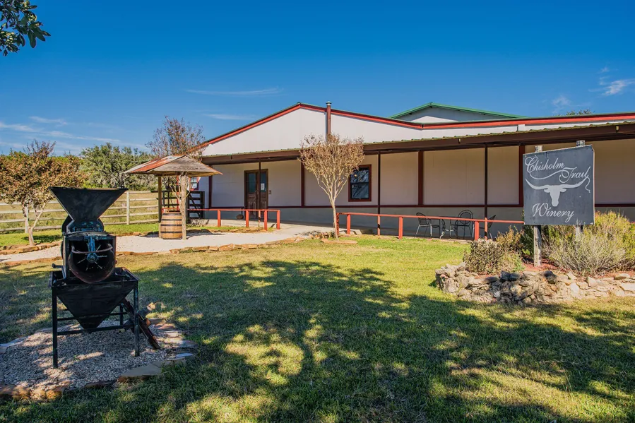 Additional features include a parking field to accommodate 50 or more vehicles. The building's interior offers a large wine production area, complete with water and floor drains, that is also well suited for other uses such as a distillery and/or a brewery. There are a number of offices and plenty of storage and meeting spaces available. An area for culinary experiences is available through the kitchen, which features a wood-fired pizza oven for making gourmet, handcrafted pizzas. The saloon-style tasting room awaits with plenty of space for quietly enjoying a glass of wine or hosting large gatherings. Outside, a covered porch provides views of the stunning Texas Hill Country along with a space for playing horseshoes.