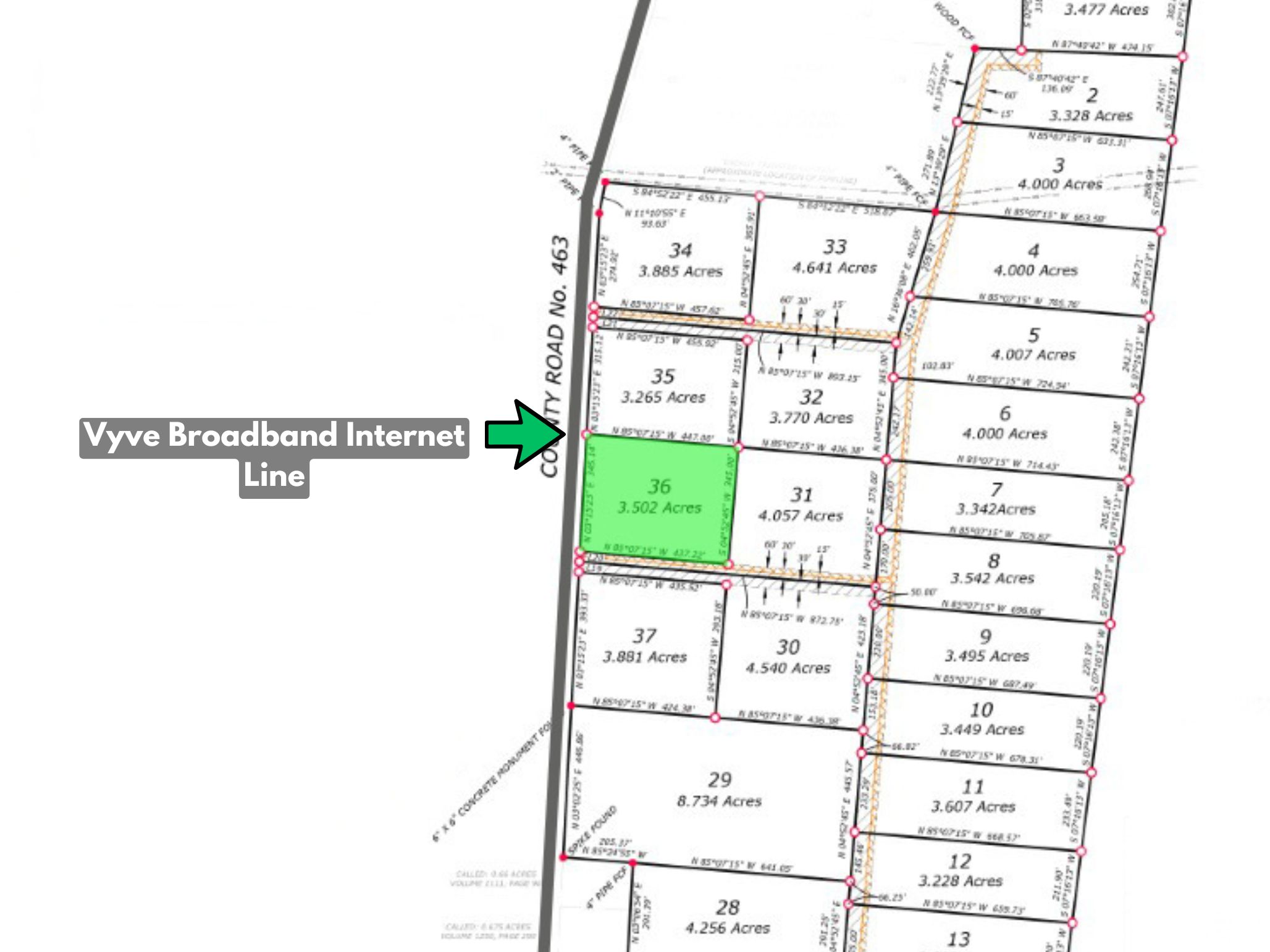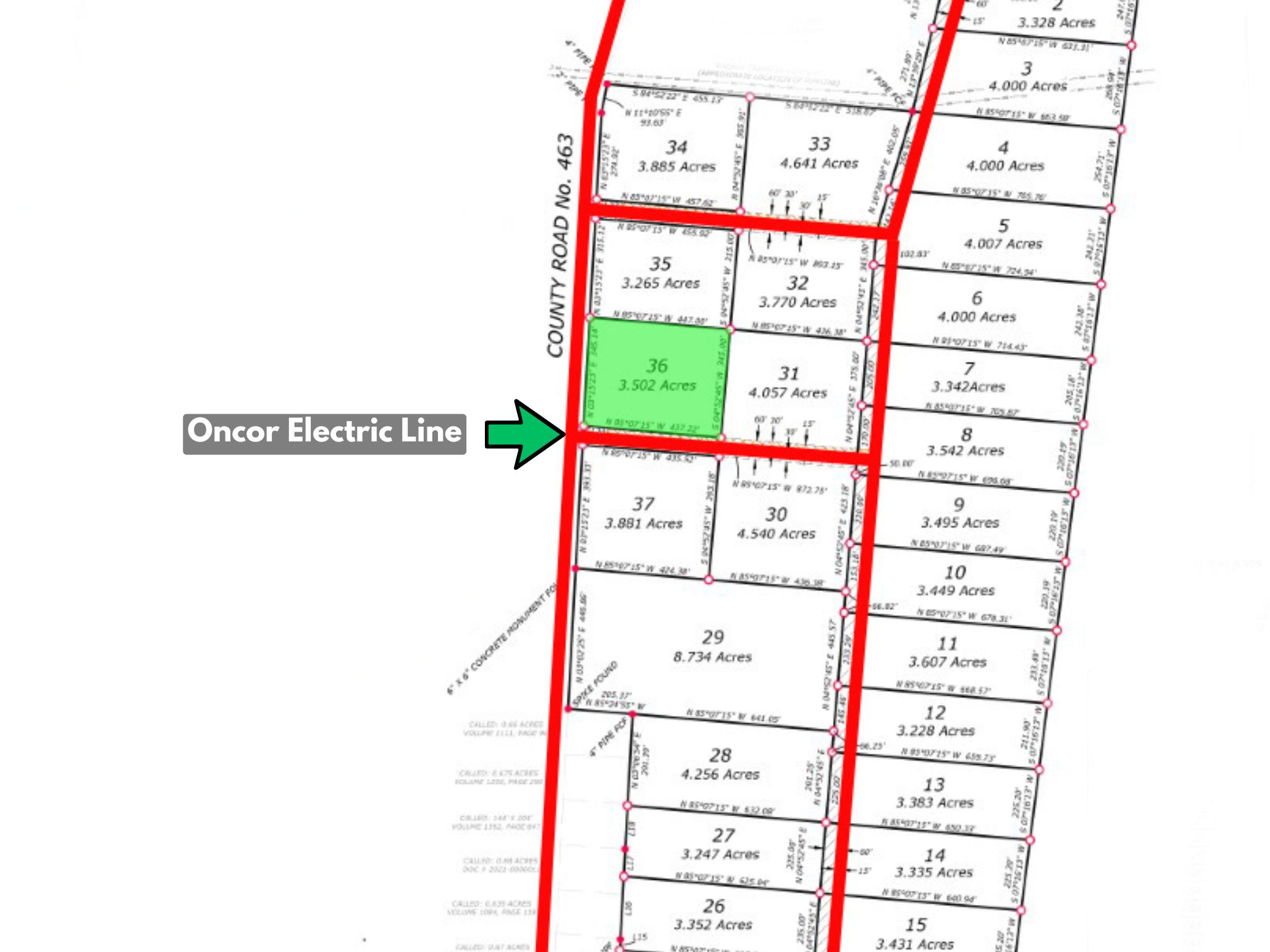 Electricity Service: Call (888) 313-6862 to reach Oncor Electric Delivery Company Llc. Lines Currently run along County Road 463 and are ready to tap for service.