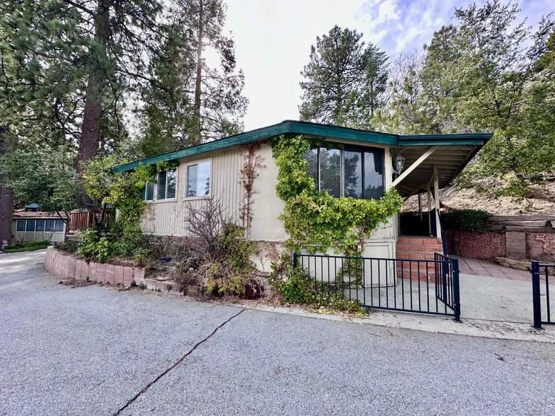 Coulter Pines RetreatListed by Idyllwild Realty - Team Stewart, this charming 1972 2-bedroom, 1-bathroom park model offers a cozy mountain lifestyle in the heart of Coulter Pines Mobile Home Park, a 55+ community. Step into the expansive entryway, complete with an inviting archway leading to the living room, which boasts a bonus space and a cozy wood-burning fireplace. The open kitchen is well-appointed with ample cabinets and counter space, perfect for your culinary needs. Adjacent to the kitchen, you'll find a convenient laundry and storage area. Down the hall, a full bathroom and two bedrooms await. The first bedroom features a private deck with serene treetop views, while both bedrooms provide ample closet space to store all your winter essentials. This home is situated on a rare double lot, offering the largest backyard in the park--ideal for outdoor relaxation or entertaining. Don't miss out on this unique opportunity to own a piece of mountain living. Schedule your showing today--this gem won't last long!