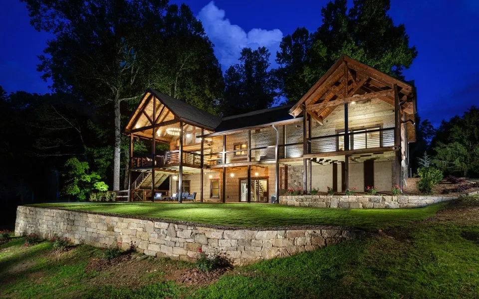 This custom built 3200+ square foot Lomonaco Log home and 3360 square foot barndominium are located minutes from some of Ellijay's most popular vineyards and apple orchards. The 3.55 acres of unrestricted land features a private pond with a gazebo and putting green. The home's kitchen features an 8 foot island and stone backsplash. The vaulted ceiling in the great room showcases Aspen ceilings that are accented with large Engelmann Spruce beams. Throughout the home, you will see a variety of different wood species mixed with stone and other natural elements. The terrace level living area has 16 foot sliding doors that open to large covered porches. The terrace level also features a bedroom and bath, as well as a workout room that could easily be converted to a bedroom. The detached Barndominium is a one of a kind. Over 3,000 sq. ft. of heated and cooled space, including a full bathroom a...