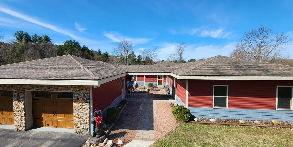PRICE REDUCED!! Discover this superior waterfront home—a meticulously maintained ranch nestled on 3.56 acres with 385 feet of frontage on the Salmon River. A long, paved driveway leads to this stunning home, privately situated along the riverbank. Inside, you'll find three bedrooms and two full bathrooms, including a large primary suite featuring a full bath, a walk-in closet, and sliding doors that open to a deck with views of the river. The kitchen is equipped with hickory cabinets and durable concrete countertops with a beautiful finish, while both bathrooms feature custom-built wood vanities in an Adirondack style. The spacious living room includes a stone fireplace and more river views. Porcelain tile runs throughout the home along with ornate decorative ceilings. This quality built home also features insulated poured concrete walls for maximum efficiency. A geothermal system provides efficient in-floor radiant heating, hot water, and electricity . The stone-paver courtyard offers a perfect setting for outdoor entertaining and gardening, complete with a two-car attached garage. This property is conveniently located within the village limits to include municipal water and sewer. The Malone Golf Course and Titus Mountain Family Ski Center are just minutes away from this home. Make this your dream home to work and play!