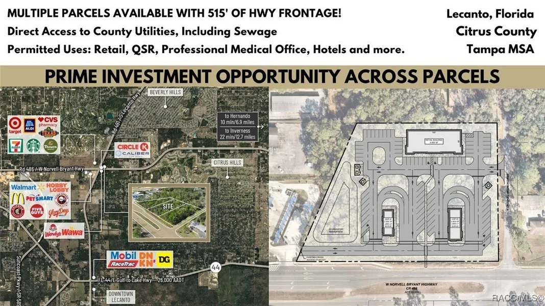 This prime multi-parcel land development opportunity is located in the Central Ridge District of Citrus County, Florida, strategically positioned within the region's largest national retail hub expansion. Surrounded by major retailers such as Target, ALDI, Walmart, McDonald's, Panda Express, Texas Roadhouse, Panera, and Starbucks, the site benefits from strong retail synergy and high consumer traffic, making it an attractive investment for commercial developers. The property consists of three parcels totaling 3.57 acres: Lot 19 (1.24 acres, 150' x 350' corner lot), Lot 20 (1.24 acres, 150' x 350'), and Lot 21 (1.09 acres, 215' x 350'). It has direct access to county utilities, including sewer, and is zoned under the PSO Commercial district (Citrus County Ch. 2 LDC), allowing for 70% lot coverage and a variety of permitted uses such as professional and medical offices, emergency rooms, regional hospitals, retail, dine-in and drive-thru restaurants, hospitality, pharmacies, medical marijuana treatment centers, assisted living facilities, and multifamily developments of up to 10 units per acre. Located at the northwest corner of CR 486/W Norvell Bryant Hwy and N Crookedbranch Drive, the property offers over 510 feet of prime frontage with full ingress and egress via a median cut, ensuring seamless traffic flow and high visibility. Disclaimer: All information provided herein is for marketing purposes only and is not guaranteed for accuracy. Prospective buyers or tenants are encouraged to conduct their own independent due diligence. The seller, broker, and associated parties make no representations or warranties, expressed or implied, as to the accuracy or completeness of this information. All dimensions, zoning details, financial data, and other property-related facts should be independently verified. Please consult with appropriate licensed professionals before making any investment or purchasing decisions.