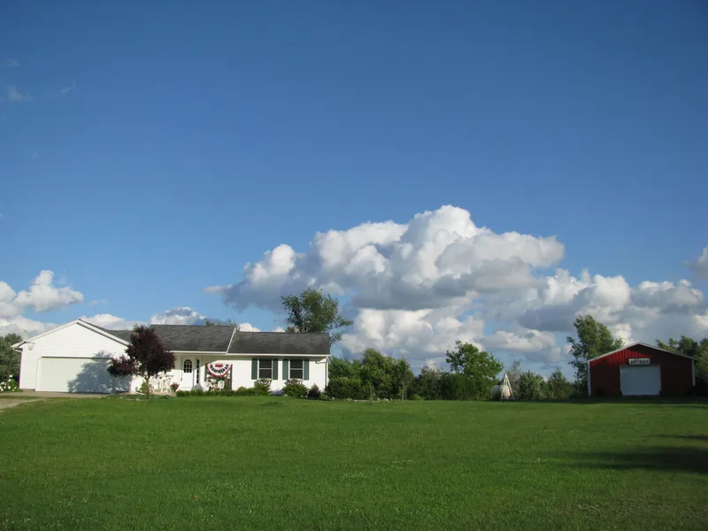 1,790 sq. ft. finished living area! Pole barn & 3.57 Acres with beautiful views! Great room! Open kitchen/dining area/living room with cathedral ceiling and sliding glass door leading to a wrap-around wood deck. Kitchen features Kraftmaid oak cabinetry, center island with large drawers, snack bar, pantry closet, corner sink and all appliances! Ceramic tile flooring in front entry, kitchen and dining area. Open stairway. You'll love the large 21x23.2 living room with recessed lighting and ceiling fan. Master suite includes walk-in closet and master bath with ceramic tile flooring and oak vanity. Plastered walls, Bryant 90+ high efficiency furnace and Peerless water softener. Newer 24x40 pole barn with workshop area! 8x16 potting shed, a gardener's delight! Driveway is shared (the north approx. 200') with neighboring property to the east. Additional 3.43 acres available to the east. Enjoy...