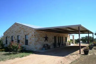 Very cute 3/2 ranch style home on almost 4 ac, originally built as a metal barn w/wood framing, then bathrooms and bedrooms added and exterior rocked. Concrete porch area with drive thru attached carport to circle drive, vaulted ceiling in big master bedroom that has three closets, one walk -in, huge open living/dining/kitchen area with vaulted ceiling in that area, and natural rough wood siding inside and unfinished kitchen cabinets for that rustic look. No built in closets in other bedrooms but have spacious hanging area that could be closed in. Stained concrete flooring, laminate wood flooring and metal ceilings give this great little place a cozy feel. Four Ramsond wall units heat and cool the residence, so you can turn on the ones you want when you are there. Small metal barn w/great storage area, two horse stalls and pen area. Back part of the property is fenced with goat fence and slick wire w/the front of the property unfenced. Portable arena, panels, livestock panels, feeders, draperies and rods do not convey. Washer, dryer, refrigerator, and dog kennel may be negotiable with acceptable offer. Island in kitchen w/granite top does convey. Horse panels/small shed are for also for sale separately. Property is located in a nice restricted neighborhood on the edge of city limits close to the Llano River, park area, golf course and new rodeo/special events center.