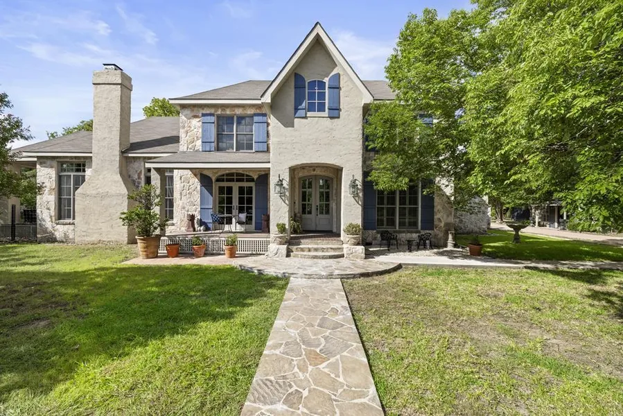 Custom French country estate on 3.66 +/- gated acres with stunning lake and Hill Country views. This custom 4-bed, 3.5-bath home blends timeless elegance with modern comfort. Located outside city limits—no city taxes, no deed restrictions—this serene property offers ultimate privacy. The main home features high ceilings, hardwood floors, a gourmet kitchen with custom cabinetry and premium appliances, and expansive windows showcasing the scenery. A large covered porch invites outdoor living and entertaining. The beautifully converted barn serves as a 2-bed, 1.5-bath guest house with full kitchen, living area, and private outdoor space—perfect for guests, multi-gen living, or rental income. The home office is located just steps across the drive, in it's own special space. Additional structure provides office space and storage. With room to roam, garden, or expand, this one-of-a-kind estate...