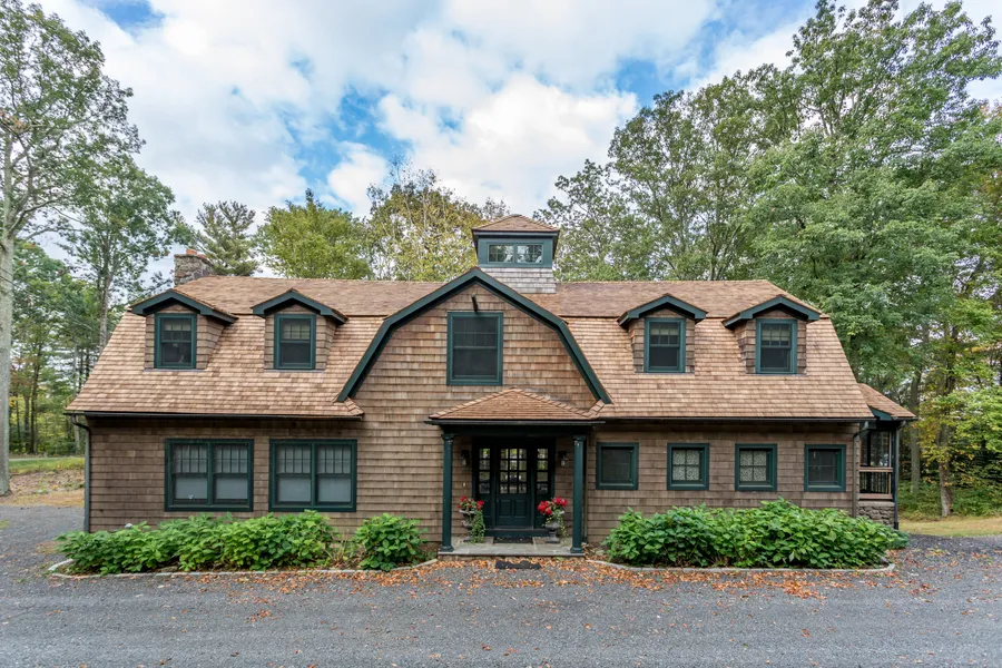 The open floor plan inspires relaxed country living with stylish furnishings against a chic, rustic interior - a welcoming and safe haven. The foyer invites guests through vintage iron gates to the dining area which opens out through French doors to an expansive 16x61 mahogany deck. To the left the spacious living room with stone fireplace serves as the main gathering place and connects to the deck through more French doors. To the right the kitchen, a chef's delight, has beautiful granite counter-tops and an onyx-topped center island. A mudroom/pantry and half-bath complete the first floor.