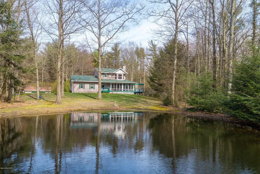 A beautiful sanctuary awaits you at the end of a private road with frontage on Grand Haven Golf Course. You'll love the character of this comfortable and meticulously maintained home featuring beautiful stonework with built-in shelving surrounding a wood burning fireplace/stove, renovated kitchen with warm Alderwood cabinetry and center island, plus a main floor office and laundry room. The wrap around covered porch (screened) opens to both the living and dining areas and embraces the natural background of this private, mature wooded property. Outside, you will enjoy a spacious deck, serene pond, and an additional 2-car garage for hobbies or extra storage. Enjoy this 3.68 acre retreat bordering GH Golf Course which is currently being transformed into a new Jack Nicholas design!