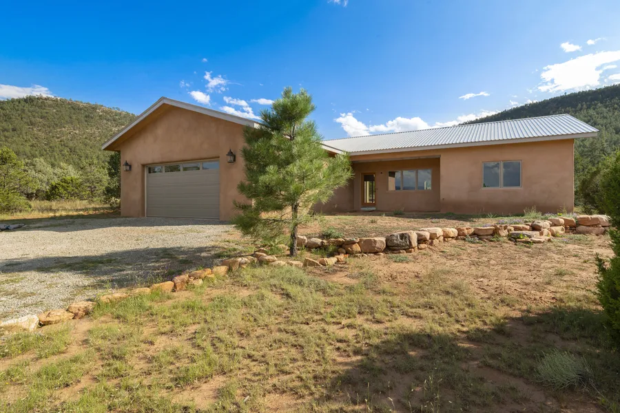 Exceptional, new construction is gated and privately sited on a 3.710 acre beautiful wooded lot with magnificent views in peaceful and serene Rowe, located 30 minutes to Santa Fe. This pitched Northern New Mexican or modern farmhouse design is filled with natural light. The great room is an open floor plan with a well-appointed kitchen plus pantry, spacious living room and dining room area. The large master bedroom has a walk-in master closet, spacious master bath with oval tub and walk in shower. The 2nd & 3rd bedroom have large closets and windows. Brick floors and wood planked ceilings in common areas. This new home is a comfortable 2,052 square feet. The attached 2 car garage has room for a shop or storage and is direct entry. Upgraded insulation and low E thermal pane windows. HUGE bonus, this property is adjacent to National Forest. Buy today and you can assist with the final selec...