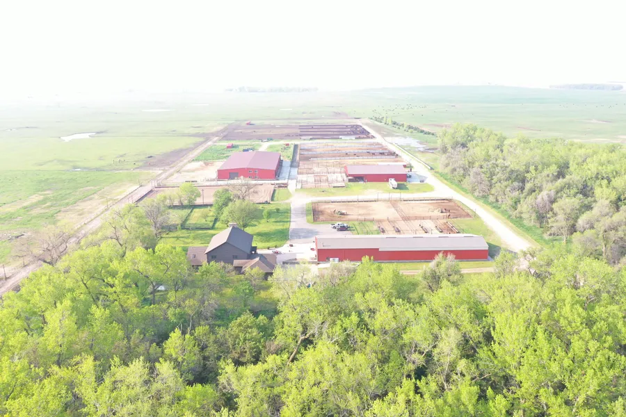 100x200 indoor, steel-framed arena building with multi-level living quarters on the north end. The building is currently set up for winter weather horse training with a horse walker, multiple collapsible pens along the walls. High-quality lighting throughout the building and a complete sound system. The indoor arena is just south of the lighted outdoor 120x200 roping arena, and is strategically planned out to use as a heifer calving facility.