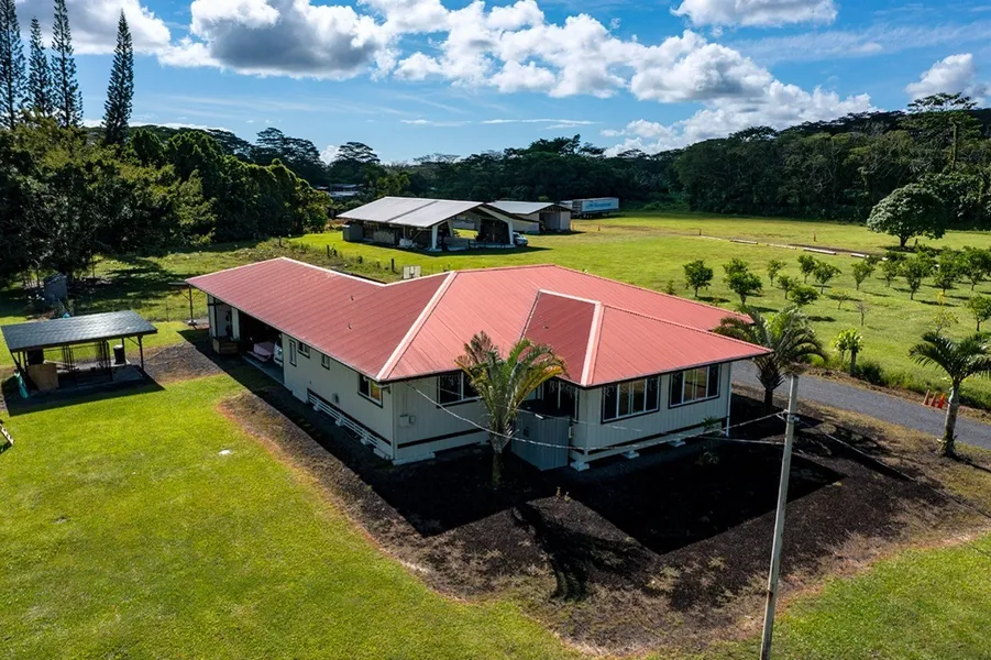 This is a leasehold property. Extremely well-maintained home and property show great pride of ownership. This home has it all with its great location, large yard, and huge carport. Inside you be welcomed by vaulted ceilings, an open kitchen, inside laundry room, fully screened lanai and a master bath with all the features (double vanity, jacuzzi tub, and a walk-in shower). The 4 car garage also has a full bath and large storage closets. Outside also has bonus features that include a covered 3 stall dog kennel with dedicated cesspool and a 1/2 acre fenced area for animals (currently has chickens).