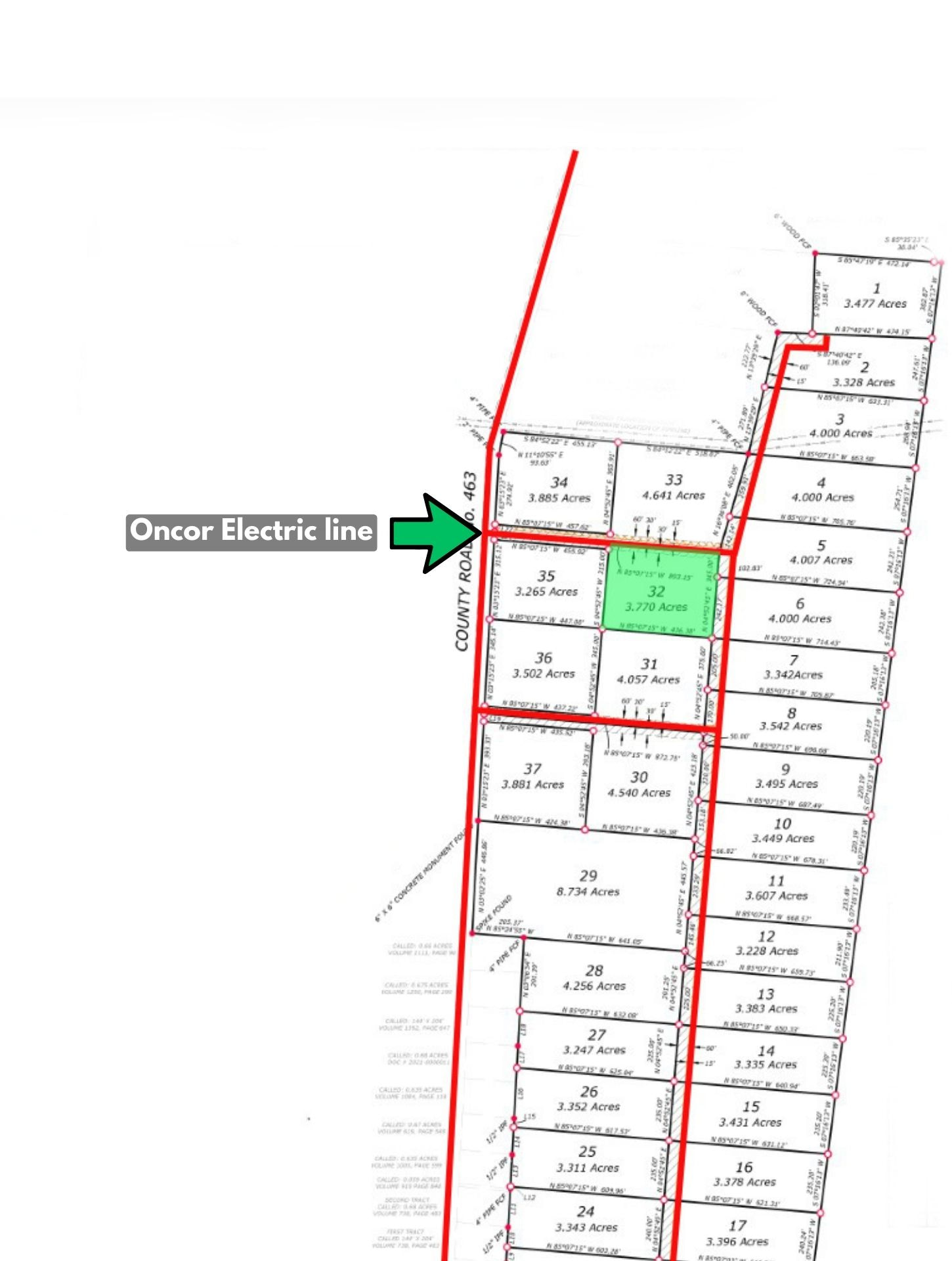 As a new customer in this development, Oncor will provide a credit of up to $8,400 in pre-paid construction fees to place your secondary poles off the main line and install your meter loop. Under normal circumstances, a secondary pole and meter loop close to the setback line may consume a budget of $2,500 - $3,000. This offers great flexibility to future customers who want to customize the placement of their home. We asked Oncor for an estimate of what eats up a $8,400 budget and the placement of 3 or more secondary poles is a rough limit on the pre-paid budget.