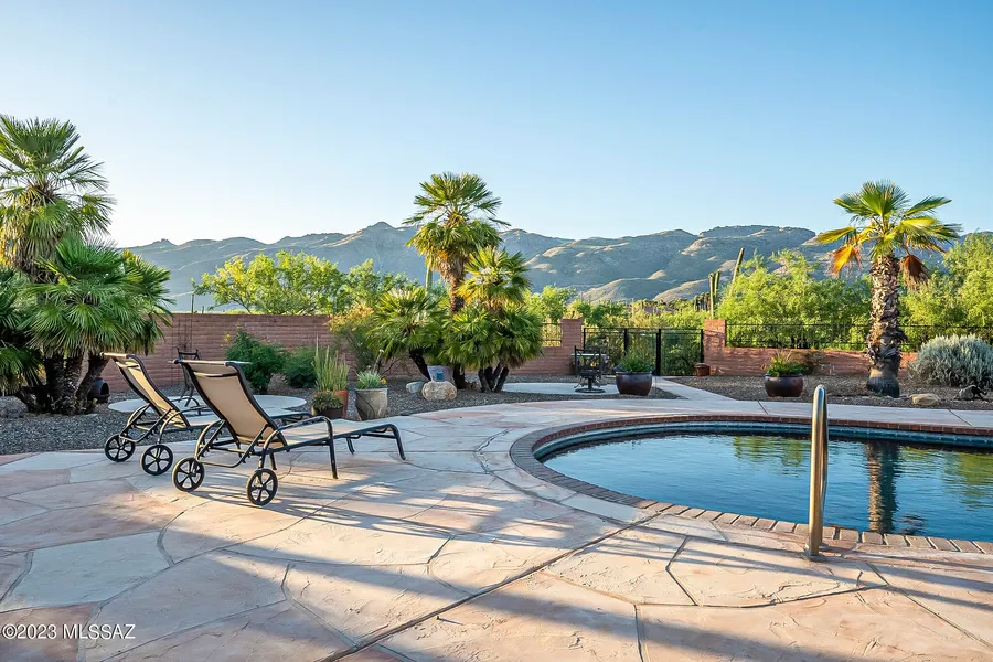 Elegant Updated Hacienda Estate on nearly 4 acres of horse property. SPACE, PEACE, TRANQUILITY and ULTIMATE PRIVACY. 4 BR 3 BA in 2587 sq ft. PANORAMIC views of the Rincon and Catalina mountains. City views as well! Resort pool and patio with exceptional privacy. Barn with large tack room and three box stalls, water and electric. Barn could be reimagined as a guest house. Large dressage/turn out arena. Covered area for RV. Two large sheds. Two water harvesting systems, one which can fill the pool. Custom cabinetry and custom concrete countertops throughout kitchen and bathrooms. Roman tub. Concrete flooring. Walk to Aqua Caliente Park or ride to the washes. Commune with nature here! These properties are not often available. An absolute Must-See oasis.