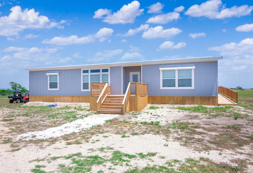 Bright, open floor plan with large living area and coffered ceilings. Wood look laminate flooring throughout. Chef's kitchen includes stainless appliances, oversize breakfast bar island with pendant lighting and stainless farm style sink. Owner's retreat offers a full bath with dual vanity, grip accessible shower and dual shower head. Wheelchair accessible ramp leads to the covered deck and back entrance. Views for miles!