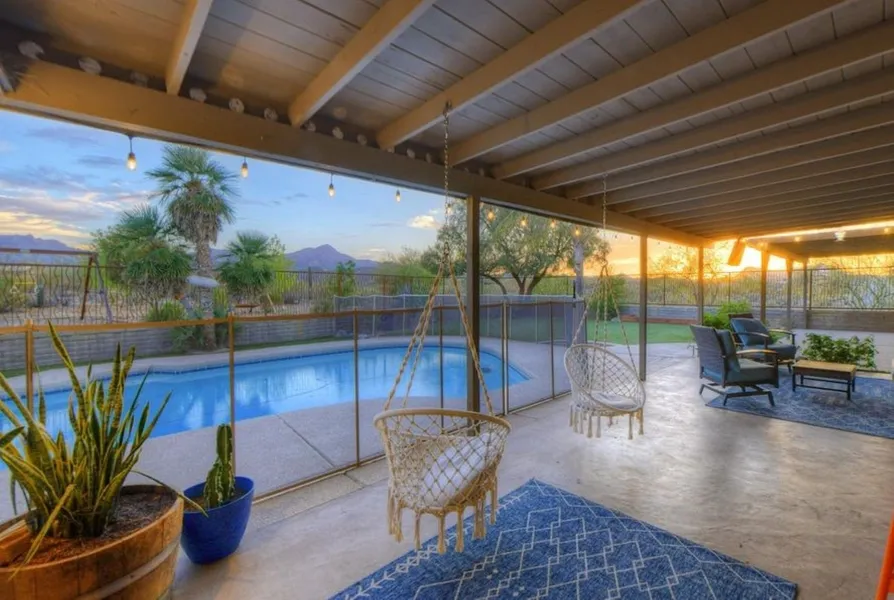 Property is zoned for horses and free of restrictions from an HOA or other restrictions on subdivided land. Long circular driveway leads to entrance of main house where you are greeted by a bright & open floor plan w/ wood-planked ceramic tile, neutral paint colors & large windows streaming in natural light. This home is 100% move-in ready-with all new windows & sliding glass doors (2020)-entire home including kitchens & bathrooms have been renovated & remodeled w/ consistent materials & design choices. Open floor plan has living room, formal dining area, family room w/ fireplace & kitchen w/ center island. Kitchen has granite counters, upgraded cabinets & newer appliances & island w/ breakfast bar for casual dining. Family room adjacent to kitchen is the perfect spot to spend time w/ family & friends. Generous sized primary suite w/dual sink vanity & floor to ceiling tiled shower. This true split bedroom floor plan has an additional 3 bedrooms & 2 bathrooms on the other side of the home. One additional bedroom is a second primary suite w/ 2 closets & en-suite bathroom. Kitchen & family room area seamlessly flow to the oasis-style backyard w/ deep covered patio, bar area, sparkling pool w/fence & large artificial turf area. Enjoy unobstructed Tucson Mountain views & spectacular sunset views from the backyard.